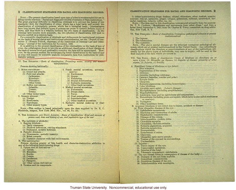 1182. (NOTE there was no detail screen online for this image - any text in brackets indicates that manuscript was unclear) 8 Classification Standards for Racial and Diagnostic Records. Note. - The present classification based upon type of crime is recommende for use in filling out the schedule "Racial and diagnostic records of inmates in State institutions." The great practical difficulty in classifying criminals os to prevent the fusion of two standards - first, the classification of crime, which has a legal basis, and second, the classification of criminalistic persons, which has a biological basis. Criminalogists[sic] have long known that definite types of persons are prone to commit definite types of crime, and thus there is a relation between the two bases of classification. As the criminal laws become more scientific, the two schemes of classification will tend to become unified on a common basis. For a scientific classification of criminals and delinquents for institutional purposes on the basis of mental status and institutional administration, see the "Report of committee 'J' (Horatio Pollack, chairman of the Institution of Criminal Law and Criminology," journal of the institution for November, 1920. If, in addition to the present classification of the criminalistic on the basis of type of crime, the collaborators desire to provide an additional classification of their charges on the basis of mental level and personality-complex the data will be appreciated. However, for the present studies, the accompanying listed classification on the basis of type of crime will supply for scientific analysis comparable data from institutions for criminalistic persons. IV. The Epileptic. - Basis of classification: Prevailing [illegible, illegible ] and [illegible] manifestations. Persons showing habitually: 1. Motor convulsions: (a) Grand mal attacks. (b) Petit mal attacks. Jacksonian. [Myoclonic]. Procursive. Other forms. (c ) Reflex convulsions. Infantile. Uremic. Tetany. (d) Other motor types. 2. Sensory seizures: (a) Vertigo. (b) Hemicrania. (c) Narcolepsy. (d) Other sensory types. 3. Frank mental [accessions], accompanied by: (a) Excitement. (b) Stupor. (c) Wandering. (d) Mental deterioration. (e) Epileptic dementia. (f) Other frank acc[e]ssions. 4. Masked mental accessions: (a) [Porformania] (b) Dream states. (c) [Pavor] (d) Dual personalities. (e) Somnambulism. (f) Other marked accessions. 5. Epileptic mental make-up or character. Note. - This outline is based principally upon the date supplied by Dr. E. C. [Fischbein], surgeon, New York (Med. Rec., vol. 90, No. [10]. V. The Inebriate and Drug Addicts. - Basis of classification: Kind and amount of poison used, time and history of use, and psychiatric type of the [user]. A. The inebriate or alcoholic: 1. Regular drinkers - (a) Daily consumers. (b) Physical defectives, craving stimulants. (c) Dissipated, morally deficient. 2. Periodic drinkers - (a) Dipsomania - periodic insanity. (b) Moral cowards. (c) Unstable character with bad environment. B. The narcomaniac: Persons showing greater or less health and character-destructive addiction to any of the following habit-forming drugs: 1. Opium and its derivatives - (a) Opium. (b) Morphine. (c) Heroin. (d) Codein. (e) Laudanum. (f) Paregoric. (g) Other opium derivatives. 2. Cocaine and its compounds. 3. Other habit-forming drugs: Sodium chloral, chloroform, ether, hashish, arsenic, mercury, [triotal], [antipyrin], ginger, cologne, [geldernium], sulfinal, paraldehyde, lavender, capsicum, tobacco, coffee, tea, etc. Note. - The data used in this classification were secured primarily from two sources: Dr. T. C. Crothers, "Morphinism and narcomania from other drugs," and from a letter dated September 9, 1921, from Dr. Charles E. Terry, committee on drug addiction, New York, N. Y. VI. The Diseased. - Basis of classification, Contagious pathological ailments at present institutionalized. 1. The leprous. 2. The tuberculous. 3. The syphilitic. Note. - The above special diseases are the principal contagious pathological ailments which are at present institutionalized in the United States. Any subordinate classifications which the directors of superintendents of any of the institutions, primarily for the above types of individuals, may care to supply, will be used in the final analysis of the data which are turned in. VII. The Blind. - Basis of classification: Causes of blindness (a) Hereditary eye or nerve defects, (b) [illegible] eye diseases; (c ) [illegible] of diseases primarily of other origins; (d) Injuries; (e) Senility. A. Hereditary types of blindness or eye defect: 1. [illegible] 2. Degeneration of the cornea. 3. Albinism. 4. Aniridia (including colebema). 5. Cataract (lamellar, [illegible] and polar). 6. Ectopic [illegible]. 7. Glaucoma. 8. Retinitis pigmentosa (including hemerolopia[?]). 9. Color blindness. 10. Atrophia nervi optici. (Lebers' disease) 11. Microphthalmus (including anophthalmus). 12. Megalophthalmus. 13. Ametropia (near and far sightedness and astigmatism). 14. Heterotropia (including ptosis and [illegible], which latter is also called strabismus or cross-eye). 15. Nystagmus. 16. Other hereditary forms. B. Acquired blindness or eye defect due to injury, accident or disease: (a) From idiopathic diseases of the eye - 17. Ophthalmia neonatarus. 18. [Truchoma and [blennorrhea] of adults. 19. Diphtheritic conjunctivitis. 20. Diseases of the cornea. 21. [illegible], cyclitis, iritis. 22. Choroiditis myopica. 23. [illegible] 24. Retinitis pigmentosa, acquired. 25. Retinitis apoplectica. 26. Neuroretinitis. 27. Detachment of retina. 28. Glaucoma. 29. Idiopathic optic-nerve atrophy. 30. Tumors of the eye and its surroundings. 31. Unclassifiable. (b) Injuries - 32. Direct injury of the eye. 33. Unsuccessful operations. 34. Injuries of the head. 35. Traumatic sympathetic ophthalmia. (c ) The eye disease being in consequence of disease of the body - 36. Diseases of the eye from syphilis.