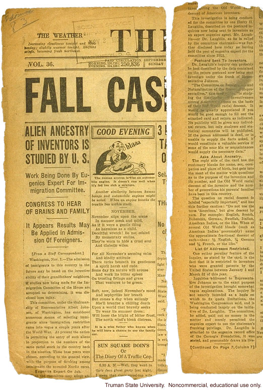 Image 1208 NOTE: Many of the headlines on this newspaper are cut off and not relevant to the article I assume was intended for transcribing. I've done the best the include the material as reference points, but will mark as [omis] any missing text. The Weather TH[omis] Increasing cloudiness tonight and Wednesday; slightly warmer tonight. Shifting winds, becoming fresh northeast. Vol. 36. Paid circulation September[omis] Morning, 124,710 Evening, 124,126 [opening bracket]250,836 Sunday[omis] FALL CAS[omis] [score] {1st column]Alien Ancestry of Inventors is Studied by U.S.[centered line] Work Being Done By Eugenics Expert For Immigration Committee. [centered line]Congress to Hear of Brains and Family[centered line] It Appears Results May Be Applied in Admission of Foreigners.[centered line] [bracket]From a Staff Correspondent.[bracket] Washington, Nov. 1 - The admission of immigrants to this country in the future may be based on the inventive ability of their grandfather's neighbors, if studies now being made for the Immigration Committee of the House are accepted as determining, it was disclosed here today. This committee, under the chairmanship of Representative Albert Johnson, of Washington, has considered numerous means of selecting immigrants since immigration restriction came into vogue a couple of years after the World War. At present the nation is permitting the entry of such aliens in proportion to the numbers of the same racial stock in the country back in the nineties. These base years were chosen, according to the general view, with the purpose of favoring among immigrants the so-called Nordic races. Eugenics Expert on the Job. [omis] the committee may adopt are [omis] [2nd column][boxed type]GOOD EVENING [cartoon]The [illegible] system is like an automobile engine. It doesn't run well when it's fed too rich a mixture. [centered dash] Another similarity between human beings and automobile engines might be noted. When an engine knocks the trouble lies within itself. [centered dash] NOVEMBER November slips upon the scene In manner meek and mild As if it were a gentle thing As harmless as a child. Deceitful wretch; Be not misled By momentary smiles, They're worn to hide a cruel soul And diabolic wiles. For all November's seeming calm And kindly attitude There lurks beneath the gentleness A spirit harsh and rude. Some day its nature will arouse And work its bitter spleen On trusting foliage and grass That ventures to be green. Soft, now, indeed November's mood And zephyrlike her breath But comes a day when suddenly She'll breathe a chilling death Upon a world that bravely seeks To wear its summer dress; Will loose the blight of bitter frost, The north wind's bleak distress.[centered dash] It is a wise father who knows when he will have a chance to use the family car.[centered dash] [boxed text] Sun Square Doin's Or The Diary of a Traffic Cop[end boxed text] 8:30 A.M. - Well, they went to their dern ghost party last night. I mean that there [omis] wife[omis] [3rd column] [omis]investigating the Old World [omis] descent of American inventors. This investigation is being conducted for the committee by one Harry H. Laughlin, Described on the post card inquiries now being sent to inventors as an expert eugenics agent. Mr. Laughlin - or Dr. Laughlin, as he is called by the committee chairman - was further disclosed here today as having held the post of eugenics expert for the committee since 192[illegible]. Postcards Sent to Inventors. Dr. Laughlin's inquiry can probably be best described by the data contained on the return postcard now being sent inventors under the frank of Representative Johnson. "The Committee on Immigration and Naturalization of the House of Representatives," says the card [omis], is studying the distribution of inventiveness among American Aliens on the basis of their Old World racial descent. It would be greatly appreciated if you would be good enough to fill out the attached card and return as indicated. No publicity will be given any individual return, but only analyses and statistical summaries will be published. If the person addressed is dead, or is unable to supply the facts asked, it would constitute a valuable service if some of the near kin or acquaintances would supply the necessary data." Asks About Ancestry. The reply side of the card has the customary blanks for name, sex, occupation and place of birth, but gets into the meat of the matter with questions as to the purpose of the inventions and its number, and the Old World racial descent of the inventor and the number of generations his parents' families have been in this country. The question on racial descent is labeled "especially important," and has this further caution: "Do not use the term 'American,' but give descent by race. For example, English, Scotch, Bohemian, German, Swedish, Italian, American Indian, or the like. When of several Old World bloods, (such as American Indian presumably)name the approximate fractional descent of each - thus: 1/2 English, 1/4 German, and 1/4 French, and the like." List of Addresses Restricted. One rather peculiar feature of the inquiry, as stated by the card, is the fact that it is restricted to inventors who were granted patents by the United States between January 1 and March 31 of this year. Inquiries addressed to Representative Johnson as to the exact purpose of the investigation brought somewhat vague explanations. The inquiry is not exactly intended as a basis on which to fix the quota limitations, the Washington Congressman said, and is being conducted largely on the initiative of Dr. Laughlin. The committee, he added, paid out no money in the matter and merely permitted the eugenics expert to use the chairman's franking privilege. Dr. Laughlin is attached to the eugenics record office of the Carnegie Foundation, it was stated, and presumably draws his live-[end of page text] [centered dash] [opening bracket]Continued on Page 7, Column 7[closing bracket]