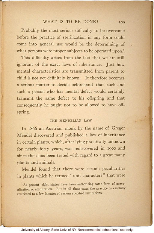 1477. What is to Done? 109 Probably the most serious difficulty to be overcome before the practice of sterilization in any form could come into general use would be the determining of what persons were proper subjects to be operated upon.[superior 1] This difficulty arises from the fact that we are still ignorant of the exact laws of inheritance. Just how mental characteristics are transmitted from parent to child is not yet definitely known. It therefore becomes a serious matter to decide beforehand that such and such a person who has a mental defect would certainly transmit the same defect to his offspring and that consequently he ought not to be allowed to have offspring. The Mendelian Law In 1866 an Austrian monk by the name of Gregor Mendel discovered and published a law of inheritance in certain plants, which after lying practically unknown for nearly forty years, was rediscovered in 1900 and since then has been tested with regard to a great many plants and animals. Mendel found that there were certain peculiarities in plants which he termed "unit characters" that were [begin footnote][superior 1] At present eight states have laws authorizing some form of asexualization or sterilization. But in all these cases the practice is carefully restricted to a few inmates of various specified institutions. [end]