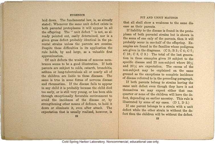 1716. [left side] Eugenics laid down. The fundamental law, is, as already stated: Whenever the same unit defect exists in both parental protoplasms it will appear in all the offspring. The "unit defect" is not, as already pointed out, easily determined, nor is a given gross defect probably identical in the parental strain unless the parents are cousins. Despite these difficulties in its application the rule holds, by and large, as a valuable first approximation. Of unit defects the weakness of mucous membranes seems to be a good illustration. If both parents are subject to colds, catarrh, bronchitis, asthma or lung-tuberculosis all or nearly all of the children are liable to these diseases. The same is true in some forms of nervous disease and rheumatism. If the disease fails to appear in any child it is probably because the child died too early, or is still very young, or has been able through exceptionally favorable environment to avoid the incidence of the disease or, by strengthening other means of defence, to hold it down or eliminate it, even after attack. The expectation that is usually realized, however, is 22 [right side] Fit and Unfit Matings that all show a weakness to the same disease as their parents. If liability to the disease is found in the protoplasm of both parental strains but is shown in the soma of one only of the parents, then it will probably occur in one-half of the offspring. Examples are found in the families whose pedigrees are given in the diagrams. (C 5; B 3; C 4; C 7; C 10; C 8, C 9.) The total of the last generation in these examples gives 18 subject to the specific disease and 23 non-subject where 20 1/2 a dn 20 1/2 are the expectation. The excess of the non-subject may be explained on the same ground as the exceptions to complete incidence of disease referred to in the preceding paragraph. If both parents belong to strains having the same unit defect even though they have it not themselves we may expect either that one-quarter or none of the children will have the defect, depending on earlier ancestry. This rule is illustrated by some of my cases. (D 1, D3.) If one parent belongs to a strain with a unit defect while the other strain is without the defect then the children will be without the defect. 23 [end]