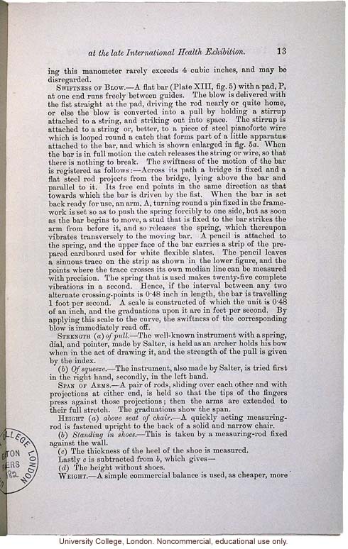 2175. at the late International Health Exhibition. 13 ing this manometer rarely exceeds 4 cubic inches, and may be disregarded. Swiftness of Blow. - A flat bar (Plate XIII, fig. 5) with a pad, P, at one end runs freely between guides. The blow is delivered with the fist straight at the rod, driving the rod nearly or quite home, or else the blow is converted into a pull by holding a stirrup attached to a string, and striking out into space. The stirrup is attached to a string or, better, to a piece of steel pianoforte wire which is looped around a catch that forms part of a little apparatus attached to the bar, and which is shown enlarged in fig. 5a. When the bar is in full motion the catch releases the string or wire, so that there is nothing to break. The swiftness of the motion of the bar is registered as follows: -- Across its path a bridge is fixed and a flat steel rod projects from the bridge, lying above the bar and parallel to it. Its free end points in the same direction as that towards which the bar is driven by the fist. When the bar is set back ready for use, an arm, A, turning round a pin fixed in the framework is set so as to push the spring forcibly to one side, but as soon as the bar begins to move, a stud that is fixed to the bar strikes the arm from before it, and so releases the spring, which thereupon vibrates transversely to the moving bar. A pencil is attached to the spring, and the upper face of the bar carries a strip of the prepared cardboard used for white flexible slates. The pencil leaves a sinuous trace on the strip as shown in the lower figure, and the points where the trace crosses its own median line can be measured with precision. The spring that is used makes twenty-five complete vibrations in a second. Hence, if the interval between any two alternate crossing-points is 0.48 inch in length, the bar is traveling 1 foot per second. A scale is constructed of which the unit is 0.48 of an inch, and the graduations upon it are in feet per second. By applying this scale to the curve, the swiftness of the corresponding blow is immediately read off. Strength ([italics]a[end italics]) [italics]of pull[end italics]. - The well-known instrument with a spring, dial, and pointer, made by Salter, is held as an archer holds his bow when in the act of drawing it, and the strength of the pull is given by the index. ([italics]b[end italics]) [italics]Of squeeze.[end italics] - The instrument, also made by Salter, is tried first in the right hand, secondly, in the left hand. Span of Arms. - A pair of rods, sliding over each other and with projections at either end, is held so that the tips of the fingers press against those projections; then the arms are extended to their full stretch. The graduations show the span. Height ([italics]a[end italics]) [italics]above seat of chair[end italics]. - A quickly acting measuring rod is fastened upright to the back of a solid and narrow chair. ([italics]b[end italics]) [italics]Standing in shoes.[end italics] - This is taken by a measuring-rod fixed against the wall. ([italics]c[end italics]) The thickness of the heel of the shoe is measured. ([italics]d[end italics]) The height without the shoes. Weight. - A simple commercial balance is used, as cheaper, more [end]