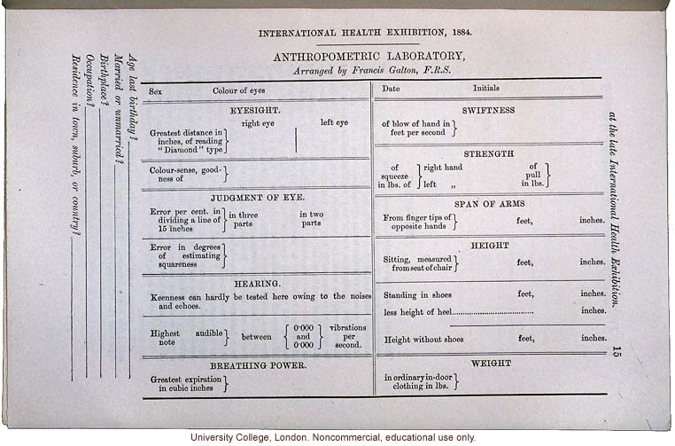 2177. at the late International Health Exhibition 15 [tabular material (form) set broadside]International Health Exhibition, 1884. [centered score] Anthropometric Laboratory, Arranged by Francis Galton, F.R.S. Sex & Colour of Eyes & Date & Initials Greatest distance in inches, of reading "Diamond" type } right eye left eye Colour-sense, goodness of} Judgment of Eye. Error per cent. in dividing a line of 15 inches.} in three parts. in two parts. Error in degrees of estimating squareness. } Hearing. Keenness can hardly be tested here owing to the noises and echoes. Highest audible note } between {0.000 and 0.000} vibrations per second. Breathing power. Greatest expiration in cubic inches.} Swiftness of blow of hand in feet per second } Strength of squeeze in lbs. of } right hand left " of pull in lbs. } Span of Arms From finger tips of opposite hands } feet, inches. Height Sitting, measured from seat of chair } feet, inches. Standing in shoes feet, inches less height of heel . . . feet, inches. Height without shoes feet, inches. Weight In ordinary in-door clothing in lbs. } [end tabular material broadside] [bottom of form, set vertical] Age last birthday? [underscore] Married or unmarried? [underscore] Birthplace? [underscore] Occupation? [underscore] Residence in town, suburb, or country? [underscore] [end]